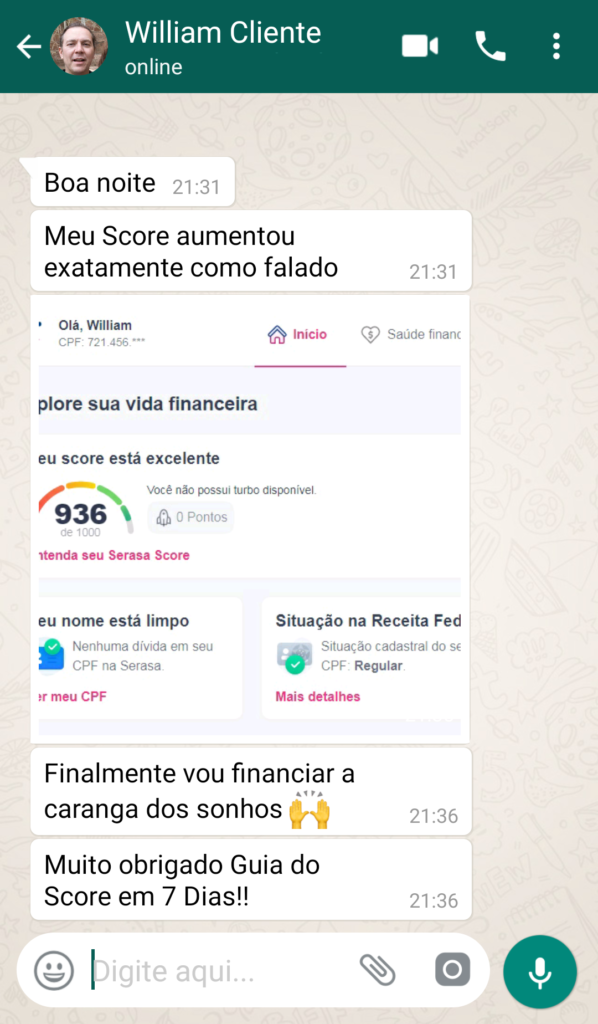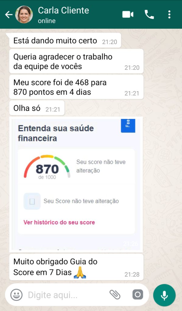 Confiamos tanto no nosso método que se em até 7 dias o seu Score não aumentar, devolveremos o valor pago.
